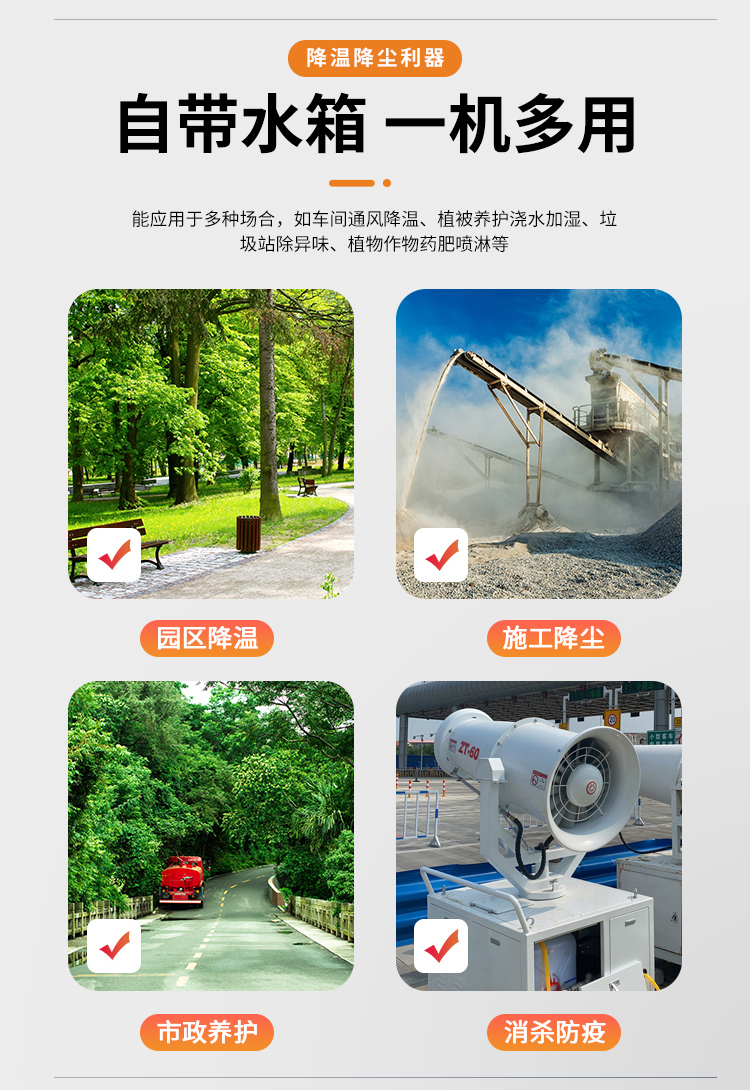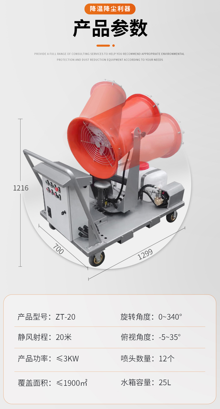 產品特點:手推移動式霧炮機降塵速度快、機結構緊湊、布局合理、移動靈活、構造簡單易維護。